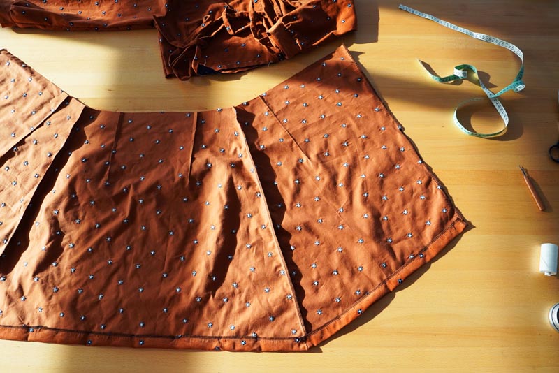 Sukni rozložíme, lícem nahoru. Přes ni položíme živůtek a ten začneme v pasové linii do sukně našpendlovat. Během práce dbáme na to, aby záševky na sukni navazovaly na záševky a princesový šev v živůtku.