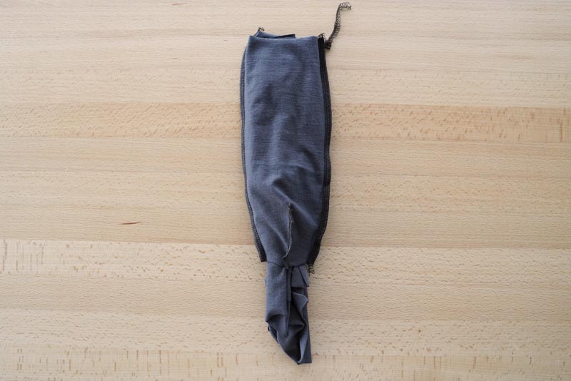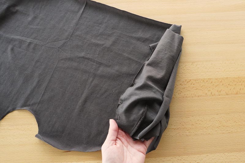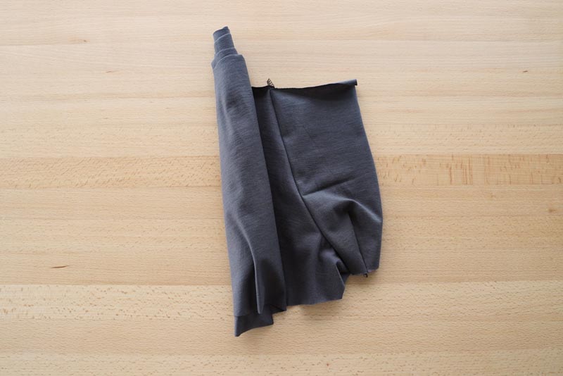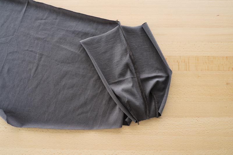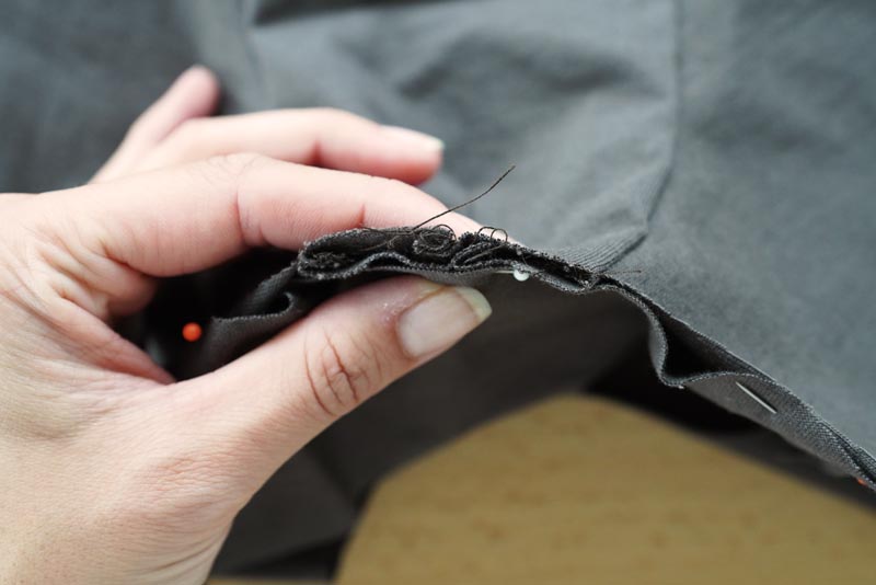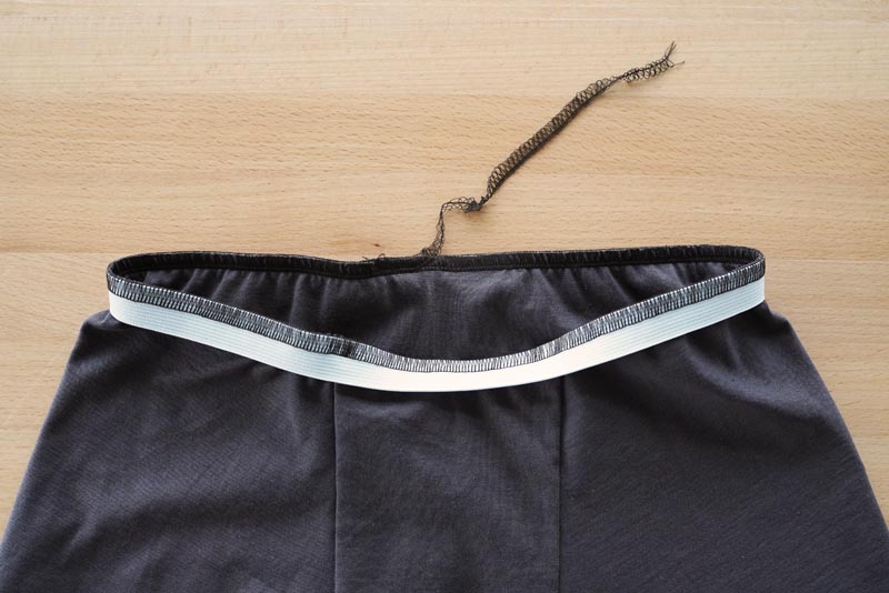 Rovnou také začistíme střižní okraj nohaviček. Pokud šijeme na overlocku, ponecháme delší konce nití a ty zatáhneme pod smyčky.