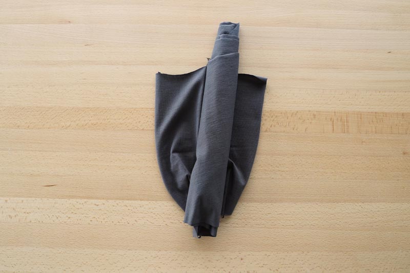 Nyní si práci rozložíme tak, abychom před sebou měli jeden přední klín lícem nahoru. Celkový díl začneme rolovat tak, abychom šev náležící k přednímu dílu měli "po ruce". Jakmile uvidíme druhý přední klín, složíme na sebe okraje jednotlivých dílů takto: