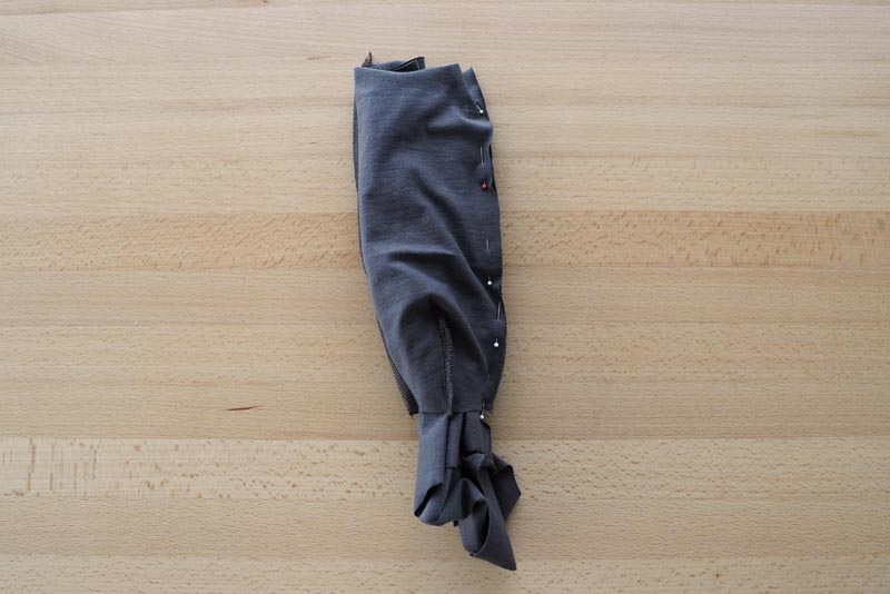 Boxerky otočíme lícem ven a pasový kraj spolu s všitou gumou podehneme do rubu, lem našpendlíme. Stejně tak si 3 cm ro budu podehneme koncovou záložku nohaviček. Našpendlíme.