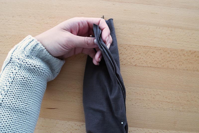 Jako první si připravíme přední klín. Oba dílce složíme napolovinu, lícem dovnitř a sešijeme záševek. Pokud šijeme na overlocku, pak u vrcholu záševku ponecháme delší konce nití a ty zauzlíkujeme zatáhneme pod smyčky.