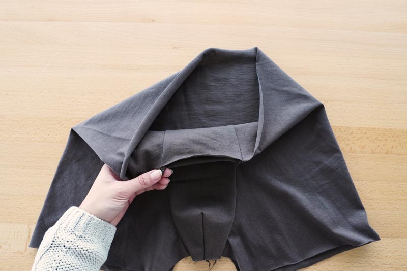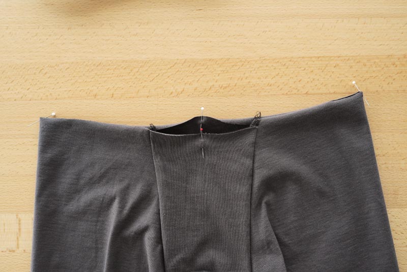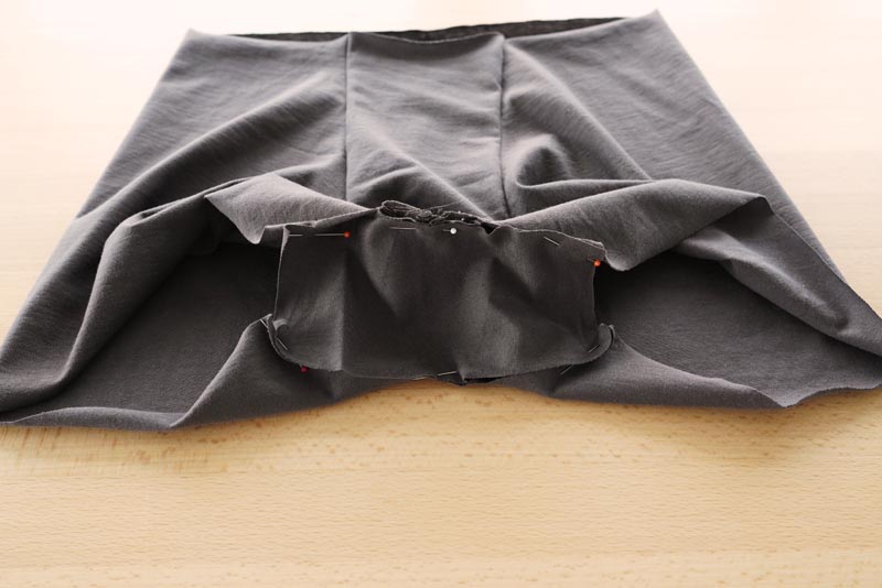Nyní si našpendlíme rozkokový klín lícem k líci boxerek. V předním klínu švový přídavky otočíme do opačných stran, abychom eliminovali počet vrstev v jednom místě. Rozkrokový klín všijeme.