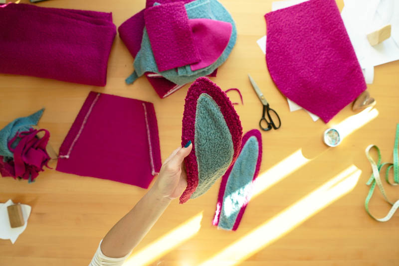 Poté položíme lícem k líci vždy páry uší k sobě a rovným stehem po obvodu sešijeme. Dolní hranu necháme nezašitou, abychom tudy mohli uši otočit na líc.