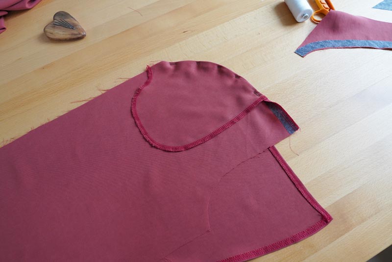 Přes zadní díly položíme ty přední, lícem k líci. Sestehujeme krokové i boční švy a vřele doporučuji provést zkoušku oděvu.