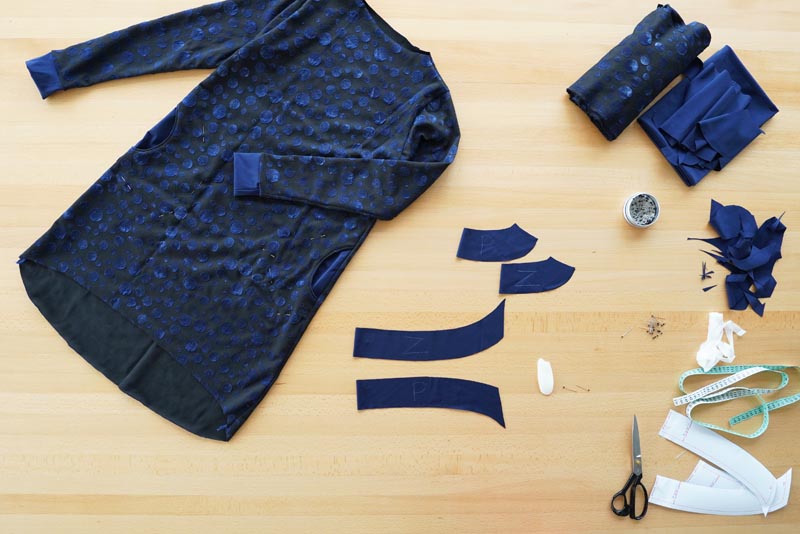 Na podsádky a lemy rukávů můžete použít stejnou látku, nebo kontrastní s podobnými vlastnostmi.