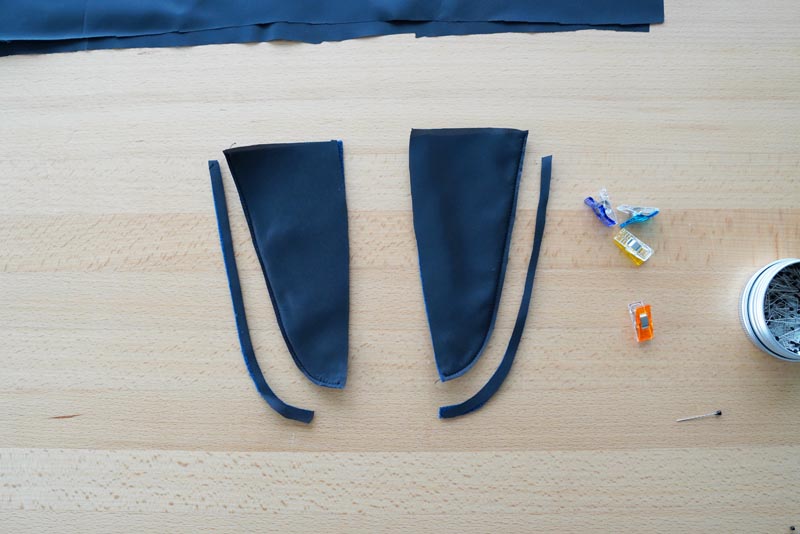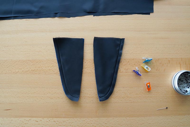 Jako první si připravíme patky pro krytí kapes. Položíme si před sebe patky z vrchové látky lícem nahoru (pozor, na obrázku níže jsou patky lícem dolů, ale nemá to žádnou vypovídající hodnotu). Přes ně položíme patkové díly podšívky, lícem dolů (podšívkové látky obvykle bývají oboulícní, tak si s tím moc nelamte hlavu). Po vnějším oblouku k sobě díly sešijeme.