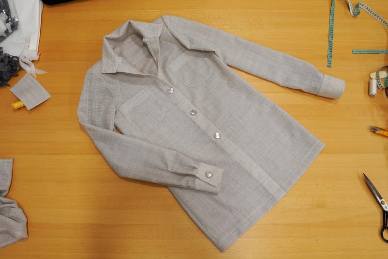 Sežehlené knoflíkové légy po lícové straně předních dílů prošijeme a práce vyžehlíme. Přebytečné kousky látky v průkrčníku odstřihneme.