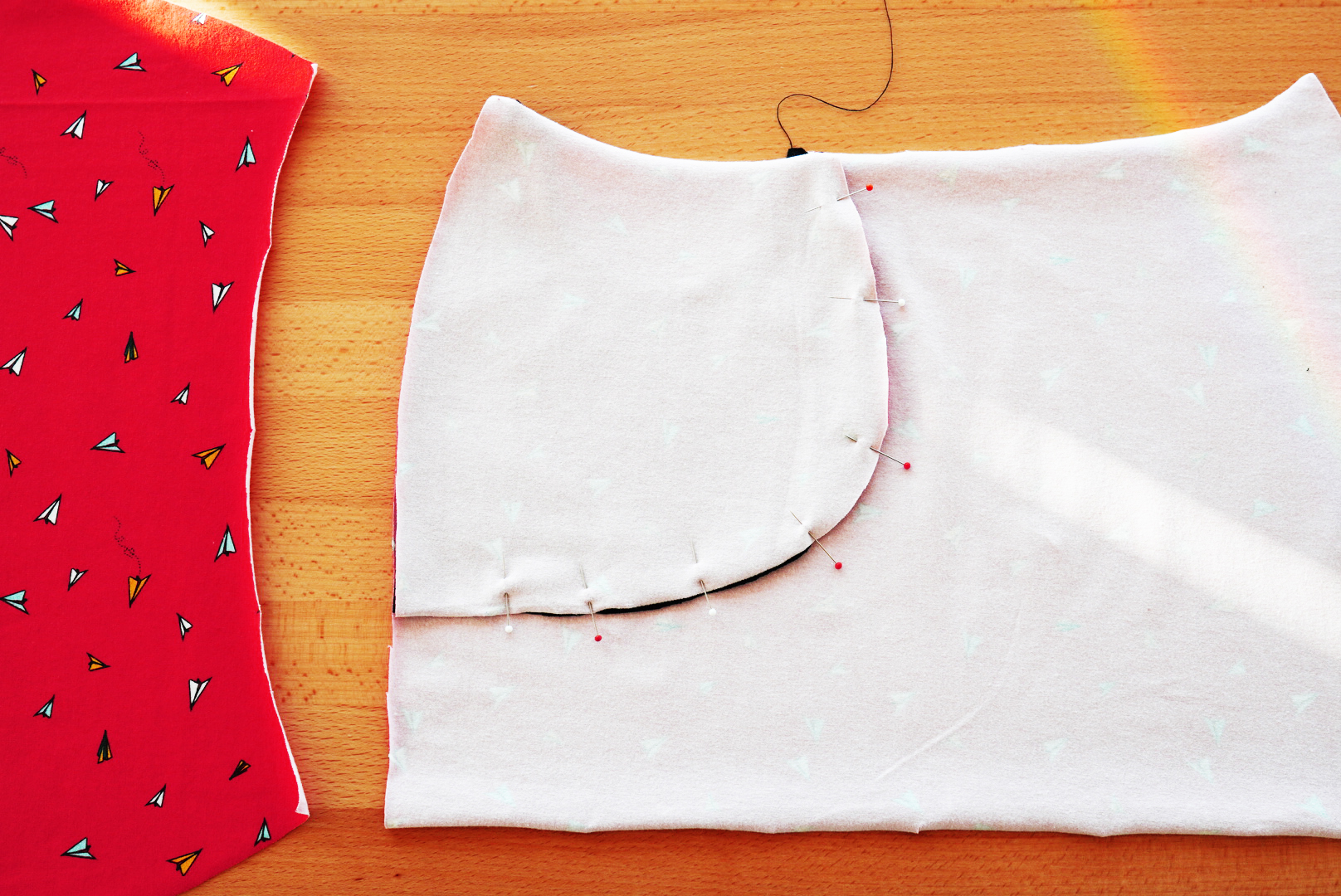 Položíme si před sebe přední díl lícem nahoru. Kapsový dílec s průhmatem položíme lícem k líci předního dílu sukně. Oba díly k sobě v kapsovém dílu sešpendlíme.