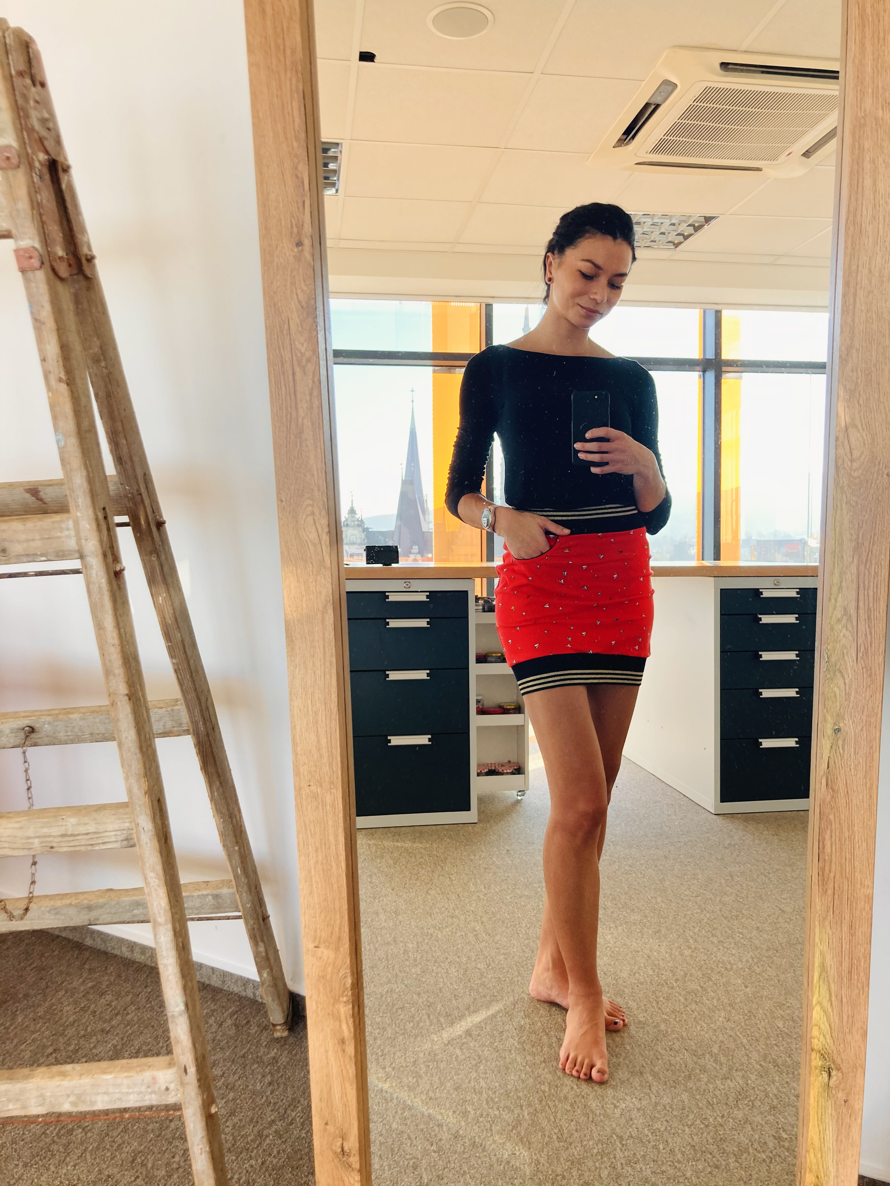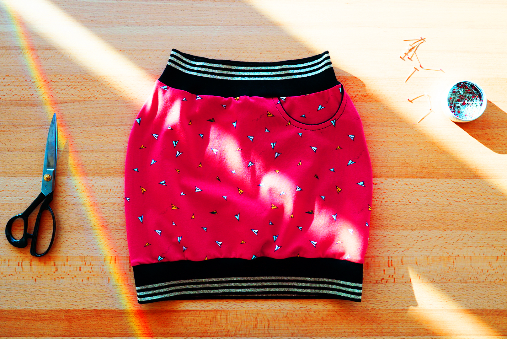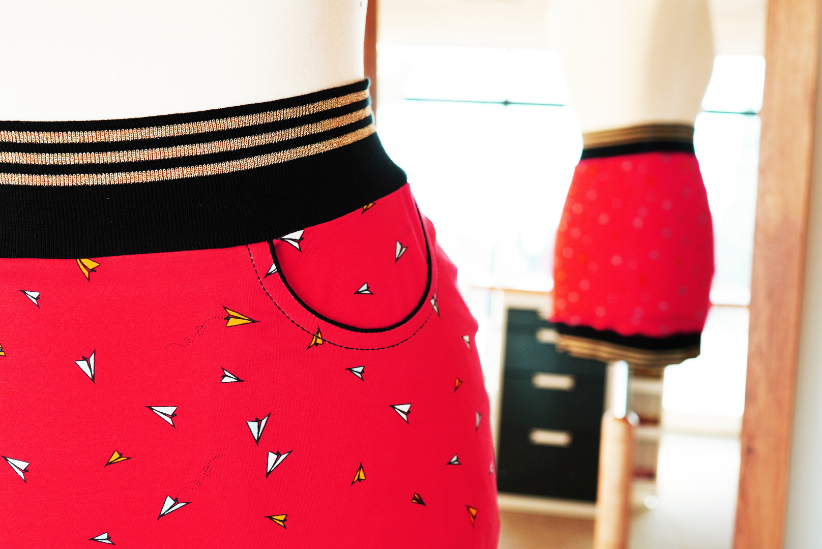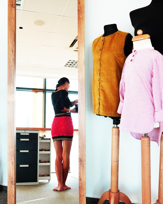 V celém obvodu přišijeme pružným stehem náplet do pasu i náplet do spodního lemu. Sukně otočíme na líc a pečlivě vyžehlíme. Sukni nosíme s radostí a náležitou pýchou, že jsme si ji sami ušily! ♡