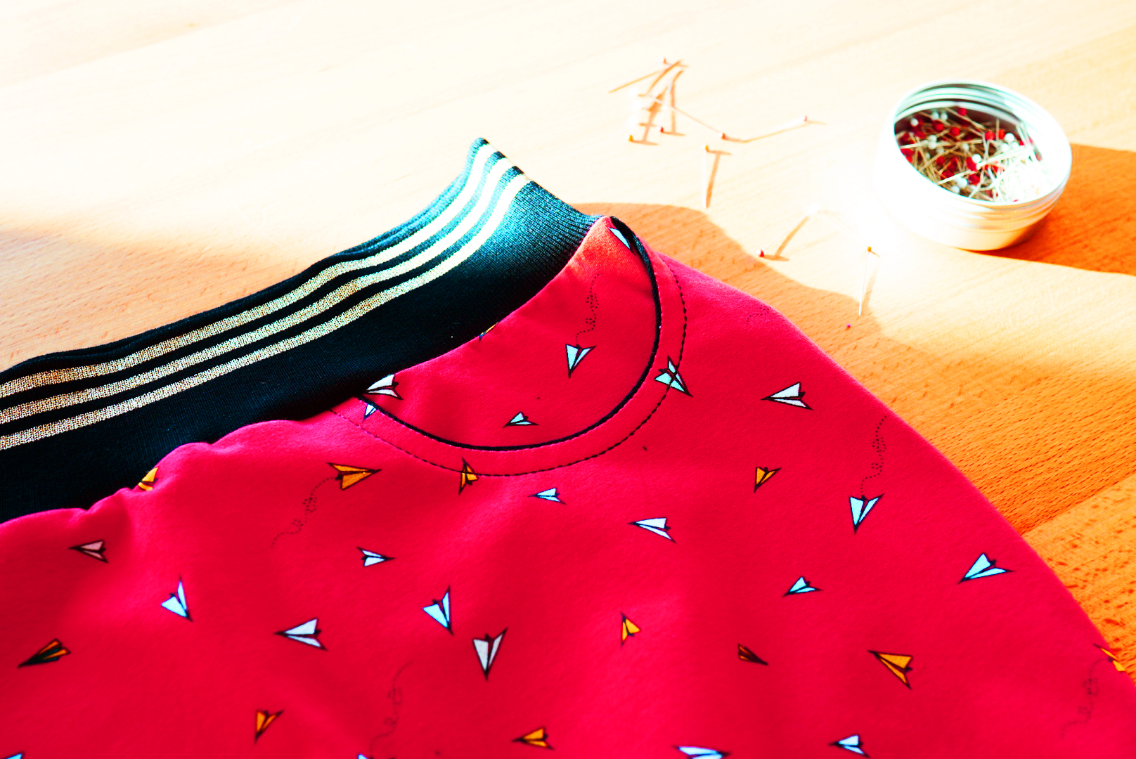 Přes přední díl, položený lícem nahoru, položíme zadní díl, lícem dolů. Oba boční švy sešpendlíme a následně sešijeme pružným švem (třeba na overlocku, cikcakem apod.).