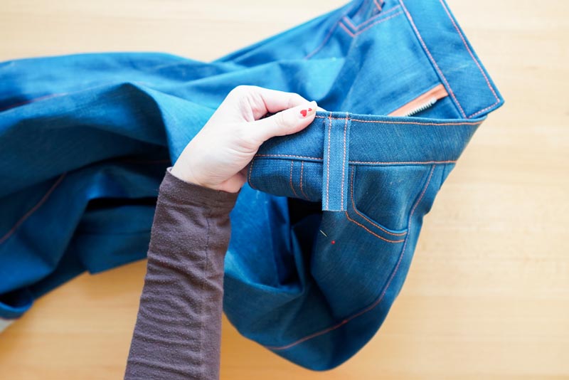 Pásek našijeme do pasové linie tak, že jeho sesazovací šev leží přesně na středu štepování v zadním sedovém švu kalhot. Delší část pásku náleží do strany s podkrytem, kratší naopak do strany s nákrytem.