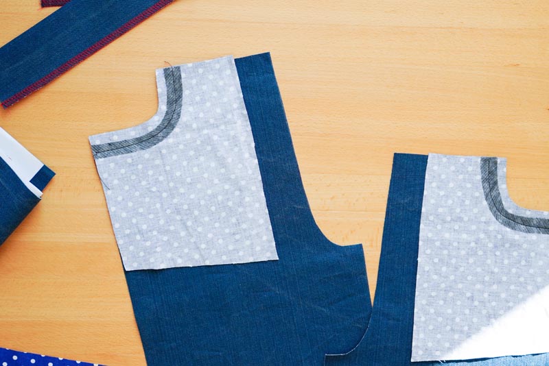 Na levý přední díl položíme nákryt, sešijeme za 2 cm a začistíme celý střižní okraj sedového švu.