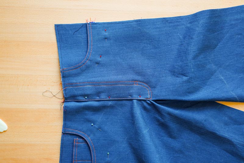 Následně si v líci kalhot sešpendlíme zbylou část předního sedového švu a po lícové straně ji dvojitě proštepujeme.