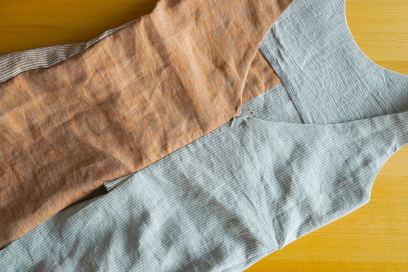 Oba díly si k sobě lícem k líci sešpendlíme od nastřiženého rohu, podél kapsy až směrem úplně dolů k lemu šatů.
