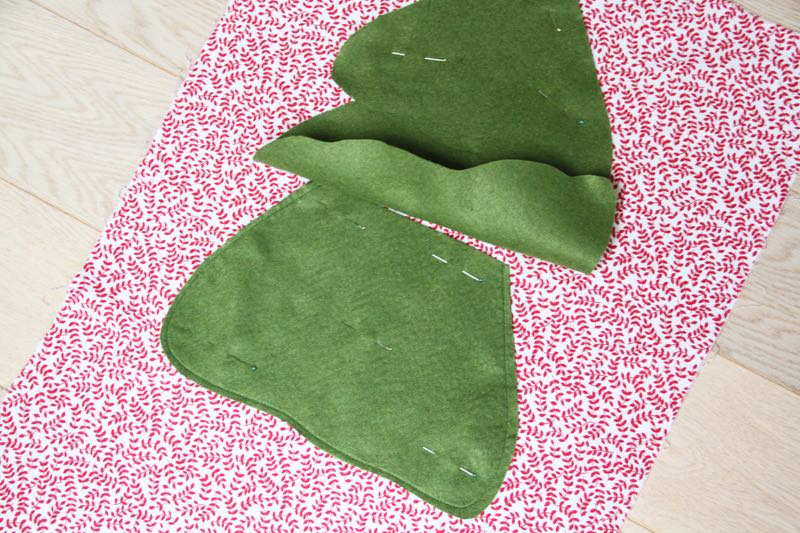 - Patra si našpendlíme do horní části plátna (doporučuji si plátno přehnout na půl, abychom si dovedli dobře představit budoucí rozložení stromu a kapsiček... (strom pak špendlíme na horní vrstvu plátna).