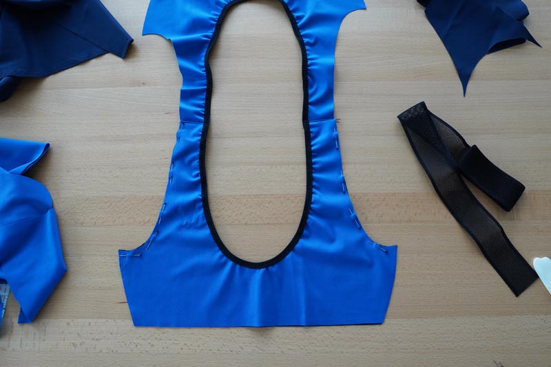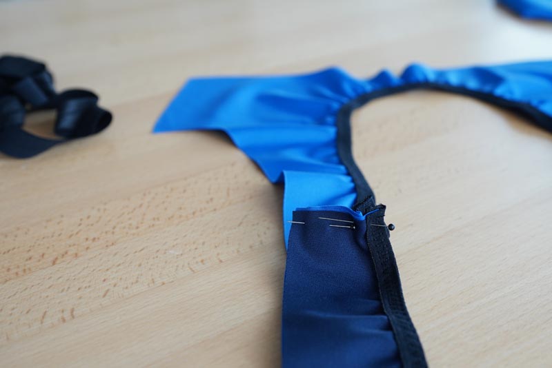Když máme olemovaný výstřih, položíme opět zadní díl na přední, lícem k líci. Sešpendlíme a následně sešijeme druhý ramenní šev.