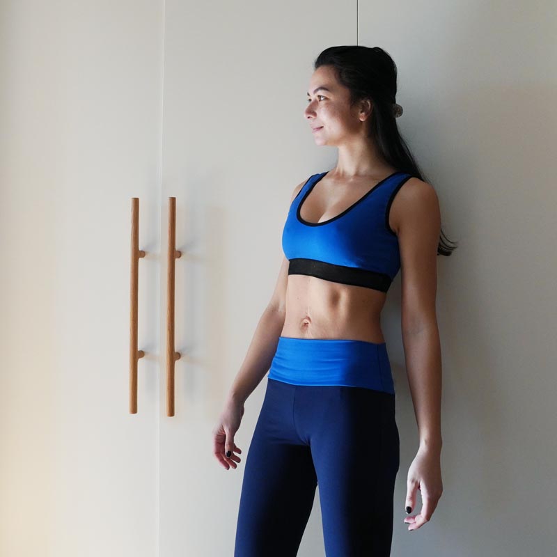 Zadní díl je bez zapínání (podprsenka se přetahuje přes hlavu). Sportovní podprsenkový top je vhodný na doma, na nenáročný sport (jóga, pilates apod.) nebo třeba na spaní. Pod prsy je možné pro větší oporu použít širokou gumu.