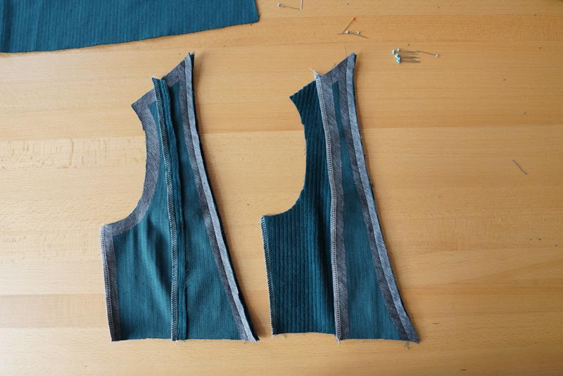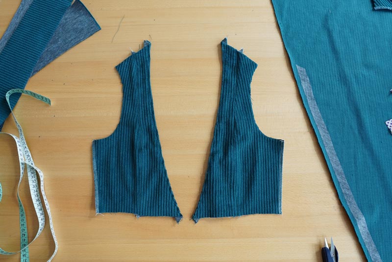 ve dvou zrcadlově převrácených předních středových dílech začistíme pouze princesové švy ![Střih a návod jak ušít dámské podzimní manšestrové šaty bez rukávů - kompletace předních dílů živůtku šatů]()