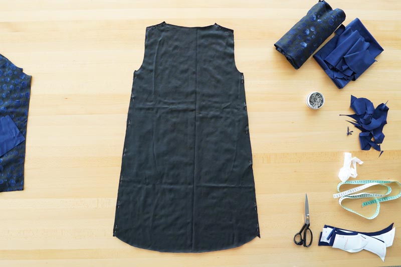 V bočních krajích šatů kapsové váčky několika stehy přišijeme nebo nastehujeme, aby se nám během manipulace se šaty nehýbaly a zůstaly na svém místě.