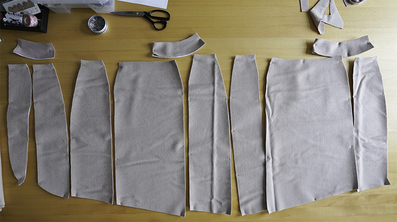 Pro přehlednost jsem všechny díly papírového střihu očíslovala tak, aby jednotlivé dílce šly přesně za sebou ve správném pořadí. To vám kompletaci dílů velmi usnadní. Všechny díly k sobě jeden po druhém lícem k líci sešpendlíme a sešijeme.