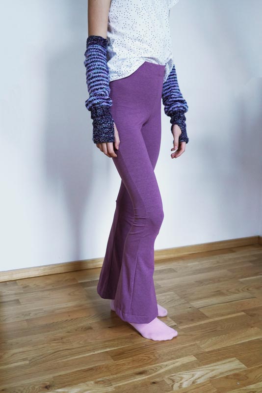 Střih na elastické zvonové legíny je vhodný pro slabší pleteniny. Vhodný je např. bavlněný úplet s elastanem nebo úplet typu French Terry, tenká nepočesaná teplákovina nižší gramáže apod.