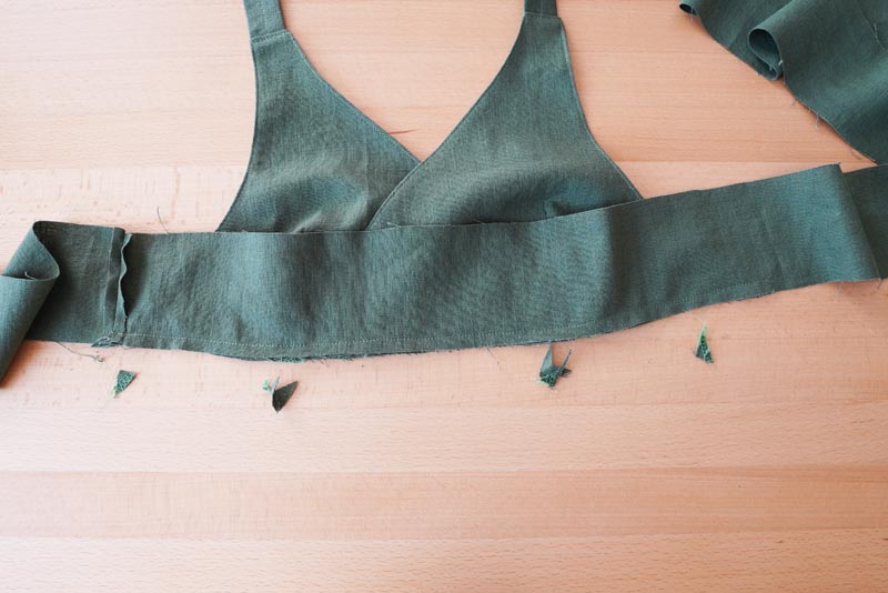 Abychom se v tom neztratili, doporučuji si šev proužku spodního lemu našpendlit do bočního kraje podprsenky. Dále našpendlit i celou spodní část podprsenky a celé vystehovat. Následně vyzkoušet na těle, jestli při zavinutí spodního lemu zůstanou dostatečně dlouhé oba konce lemu pro zavázání.