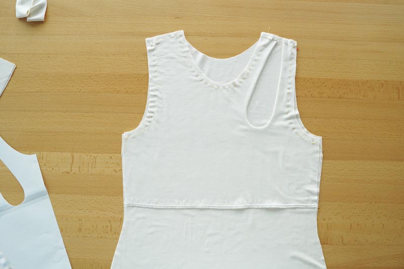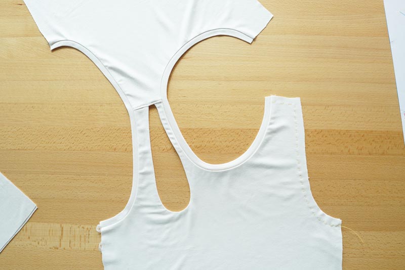 Přední a zadní díl na sebe složíme lícem k líci. Sešpendlíme a následně sešijeme pravý ramenní šev.