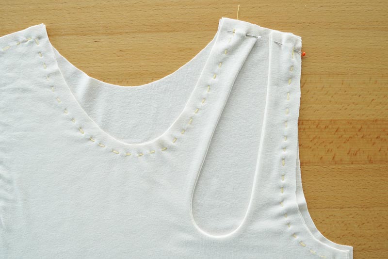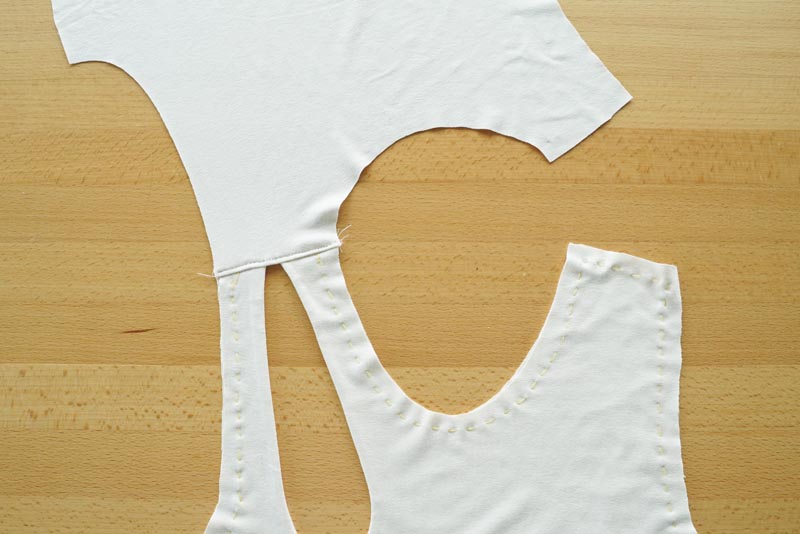 Aby se nám během dalšího šití po sobě díly neposouvaly, sestehujeme si je k sobě. Stehujeme podél průkrčníků, průramků a ramenních švů. Stehujeme přibližně 1,2 cm nebo 0,8 cm od střižních okrajů, aby šla po sešití stehovka dobře vytáhnout (švové přídavky jsou 1 cm, proto stehování vedeme těsně vedle budoucí linie švu).
