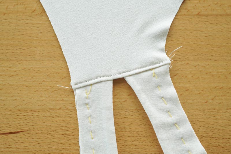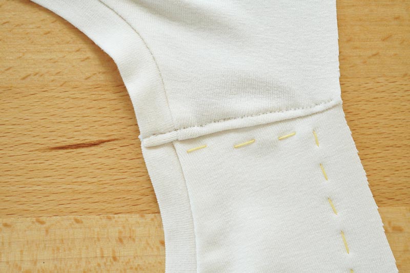 Připravené proužky úpletu složíme podélně na polovinu lícem ven a olemujeme s nimi otevřený průkrčník a otevřený levý průramek. Během šití proužek lehce natahujeme, ale ne příliš - tím by se nám tvar i velikost průkrčníku/průramku výrazně zdeformoval.