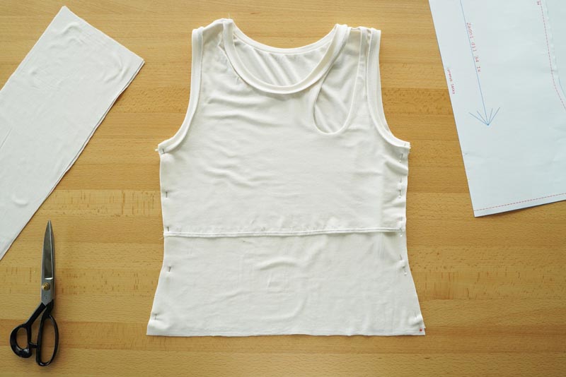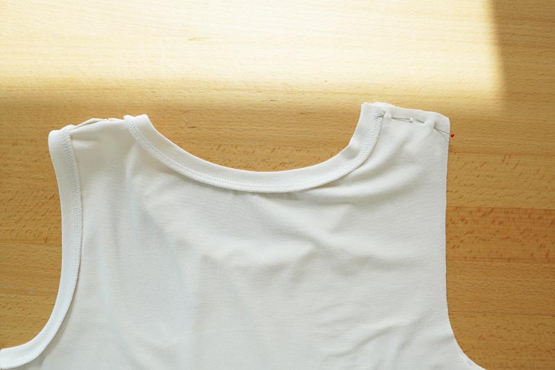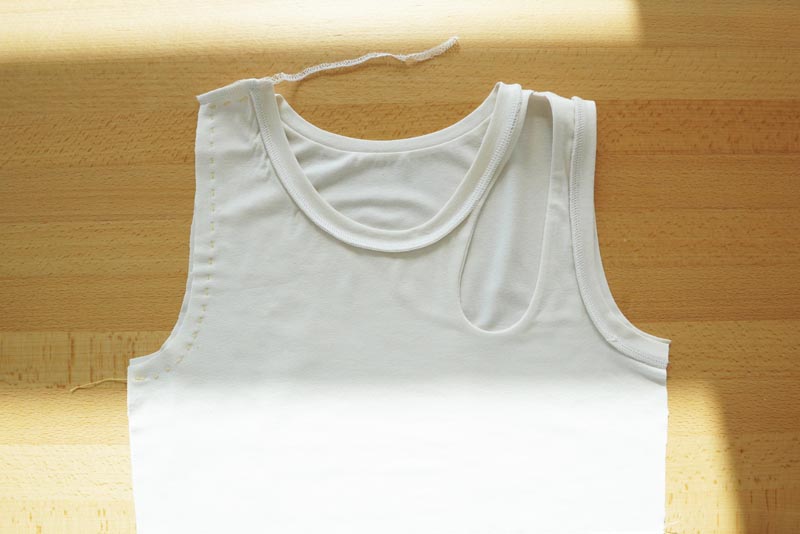 Položíme si před sebe zadní díl, lícem nahoru. Přes něj položíme přední díl i s podsádkou tak, abychom k sobě měli nasměrovanou podsádku lícovou stranou. Tzn. Přední a zadní díl na sobě leží lícem k líci. Sešpendlíme a následně sešijeme levý ramenní šev. (Levý myšleno při oblečeném tílku, z pohledu naruby položeného tílka na stole je to ramenní šev ležící napravo.)