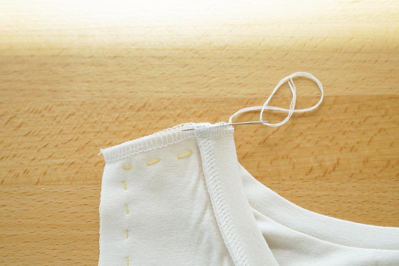 Pokud šijeme na overlocku, pak si u výstřihu ponecháme delší konec řetízku a ten zatáhneme pod smyčky.