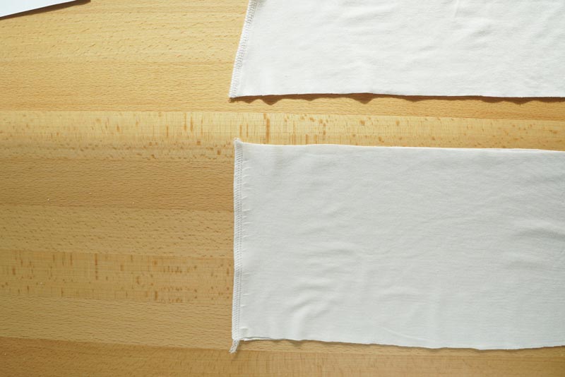 Dále budeme potřebovat proužky úpletu na olemování průkrčníku a průramků. Proužky si nastříháme v šířce 3,5 cm. Pokud budeme mít více kratších proužků, měla by být délka jednotlivých proužků alespoň cca 60 cm.