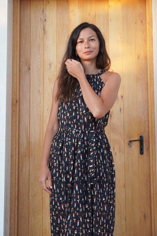 Vhodných látek na tyto šaty je více. Důležité je, že by mělo jít o tkaniny (pevné, nepružné látky), které jsou spíše lehčího charakteru, aby sukně ve svém objemu nepůsobila těžce. Na tyto šaty jsem použila šifon s autorským potiskem z obchodu Tufka.cz: Šifon s houbičkami