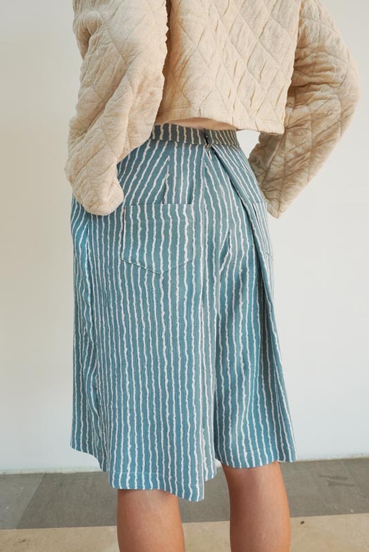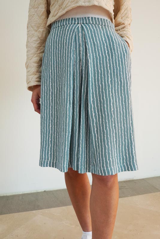 Kalhotová sukně je v délce ke kolenům, ale snadno si ji můžete prodloužit či naopak zkrátit. Kalhotová sukně má v předním díle dvě klínové kapsy a na zadních dílech nakládané kapsy.