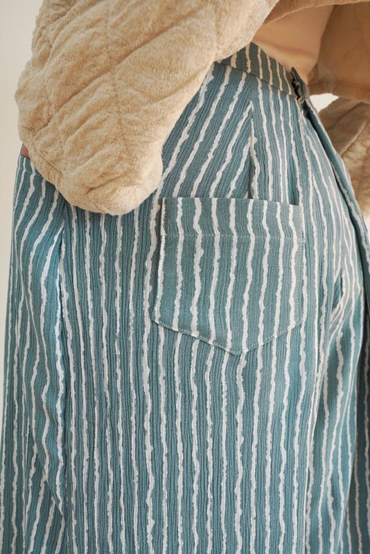 Teď přichází čas na první zkoušku. Kalhotovou sukni si oblékneme a zkontrolujeme pas a sed, jestli nám sukně sedí. Protože ještě nemá pásek, měla by být sukně v pase o pár milimetrů volnější, v žádném případě by neměla v pase škrtit již teď, to by se po všití pásku ještě zhoršilo...
