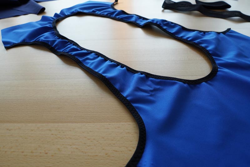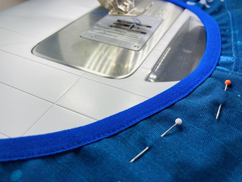 Nyní olemujeme výstřih půlenou pruženku. Jak na lemování najdete například v tomto souhrnném videu na různé druhy lemování. Pro lemování přímo půlenou pruženkou přeskočte na 20. minutu videa.